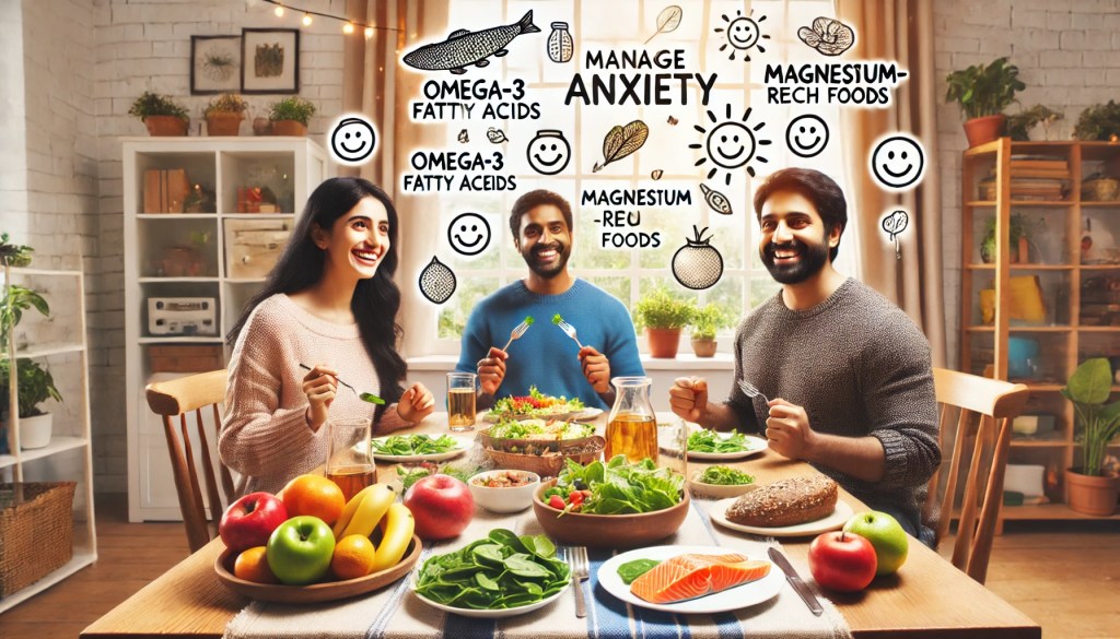 ਉ ਦਾਹਰਨ: ਓਮੇਗਾ-3 ਫੈਟੀ ਐਸਿਡ ਨਾਲ ਭਰਪੂਰ ਖੁਰਾਕਾਂ, ਜਿਵੇਂ ਕਿ ਸੈਲਮਨ, ਅਤੇ ਮੈਗਨੀਸ਼ੀਅਮ ਨਾਲ ਭਰਪੂਰ ਖੁਰਾਕਾਂ, ਜਿਵੇਂ ਕਿ ਪਾਲਕ, ਚਿੰਤਾ ਨੂੰ ਘਟਾ ਸਕਦੀਆਂ ਹਨ।