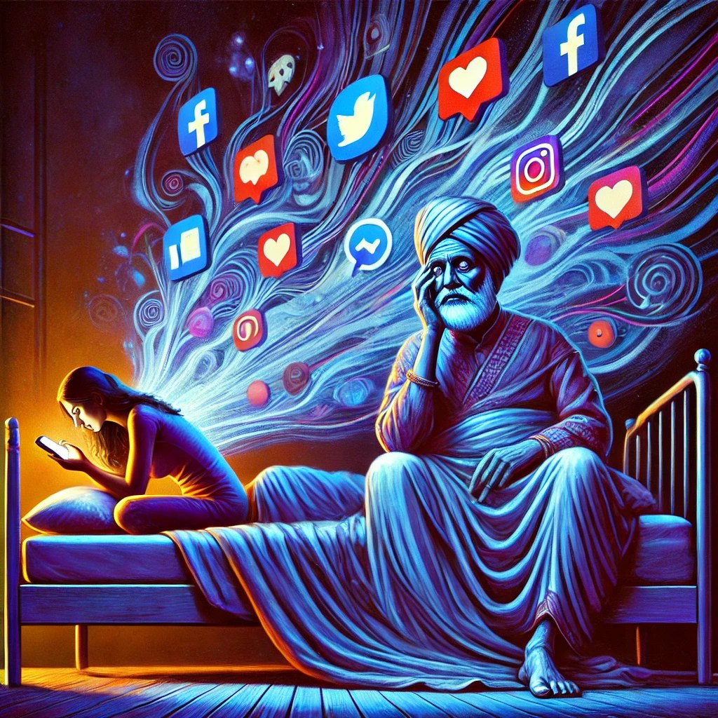 उदाहरण: स्क्रीन से निकलने वाली नीली रोशनी और लगातार सूचनाएं नींद के पैटर्न को बाधित कर सकती हैं, जैसा कि अध्ययनों में सोशल मीडिया उपयोग और नींद की कमी के बीच संबंध में देखा गया है।