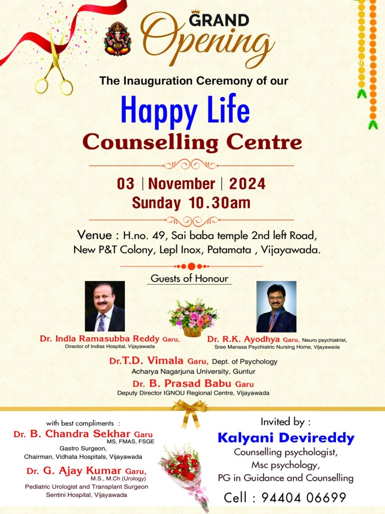 Vijayawada, November 3, 2024 — In a remarkable step toward enhancing mental health resources in the region, the Happy Life Counselling Centre officially opened its doors today in Vijayawada. Located near the Sai Baba Temple on the second left road of New P&T Colony, LEPL Inox, Patamata, this new facility aims to offer professional psychological counselling services to support individuals and families.