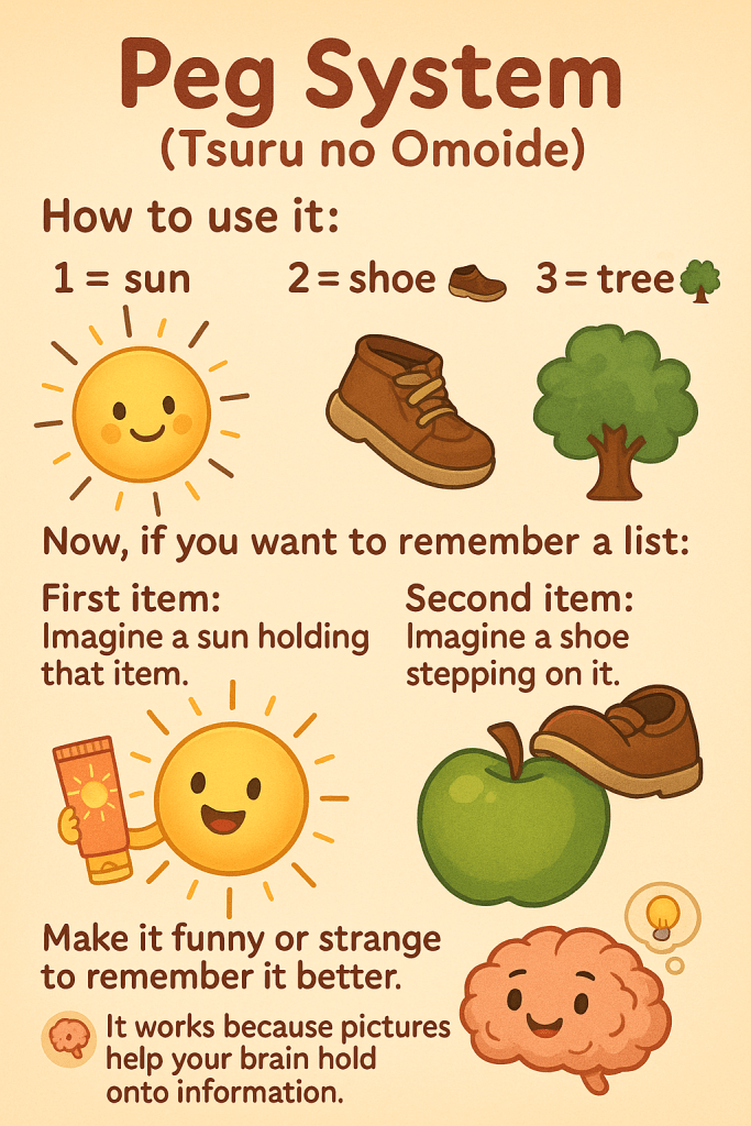 In Japan, the crane symbolizes long life and memory. The Peg System helps you remember things by connecting numbers to vivid images: 1 = sun ☀️, 2 = shoe 👟.