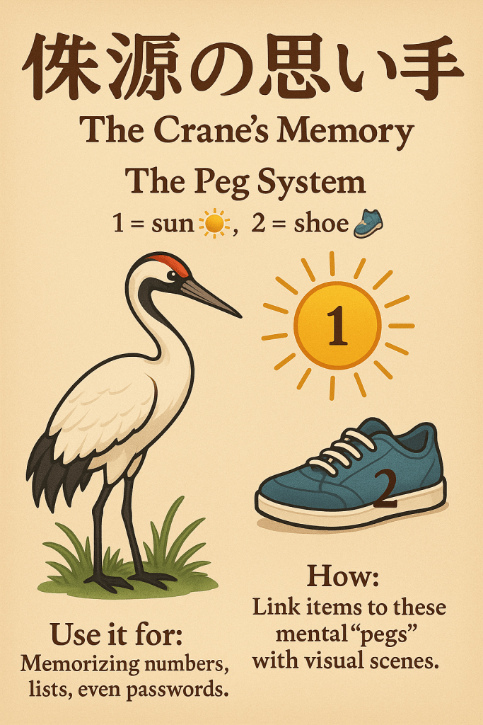 जपानमध्ये क्रेन पक्षी दीर्घ आयुष्य आणि स्मरणशक्तीचं प्रतीक आहे. Peg System मध्ये प्रत्येक संख्येला एक चित्र दिलं जातं: 1 = सूर्य ☀️, 2 = शू 👟.