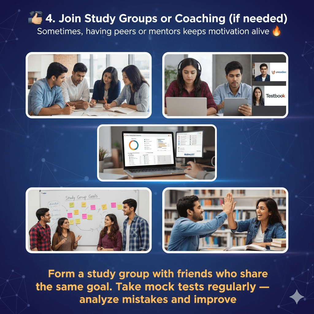 🤝 4. Join Study Groups or Coaching (if needed)