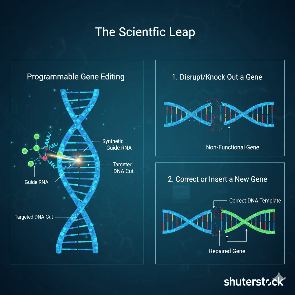 Scientists realized they could program this system. By simply creating a synthetic guide RNA that matches any DNA sequence in any organism, they could direct the Cas9 enzyme to cut the DNA at that exact location.9 Once the DNA is cut, the cell’s natural repair mechanisms kick in, allowing scientists to: