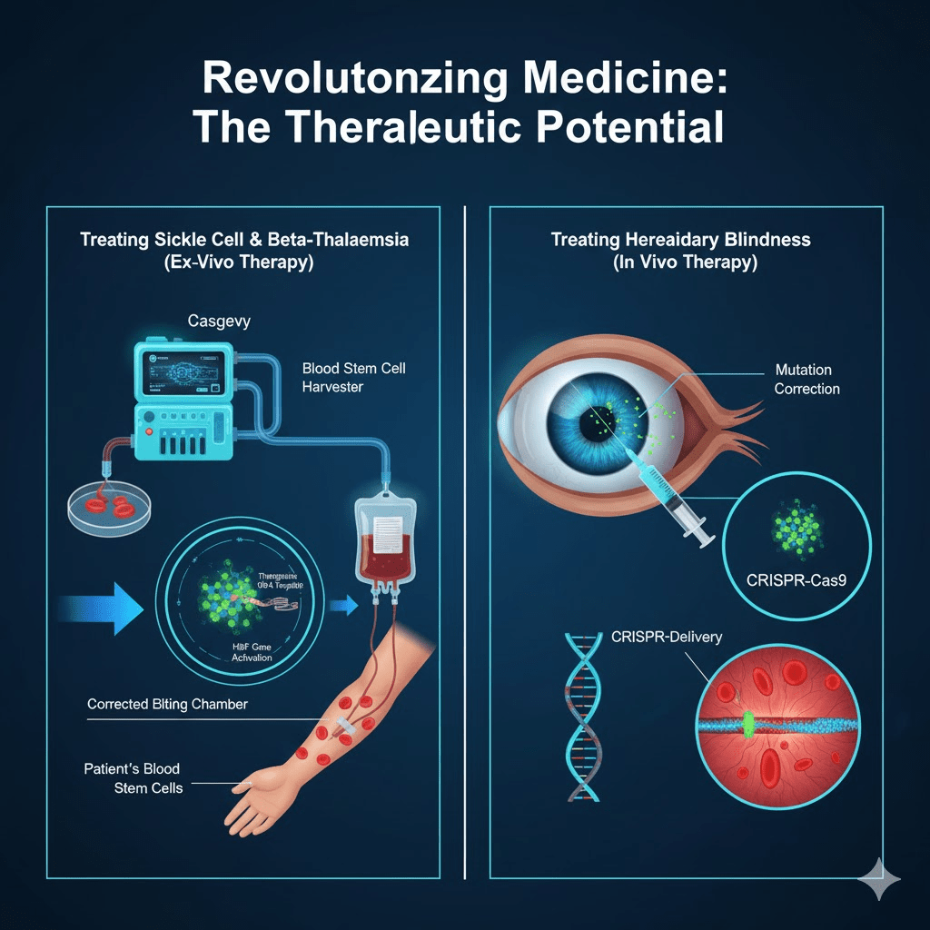 - Sickle Cell Disease (SCD) and Beta-Thalassemia: These are blood disorders caused by mutations in hemoglobin genes.17 The first FDA-approved CRISPR therapy, Casgevy, works by editing the patient’s own blood stem cells outside the body (ex vivo) to turn on the production of a healthy form of hemoglobin (fetal hemoglobin), effectively curing the disease in many patients.18