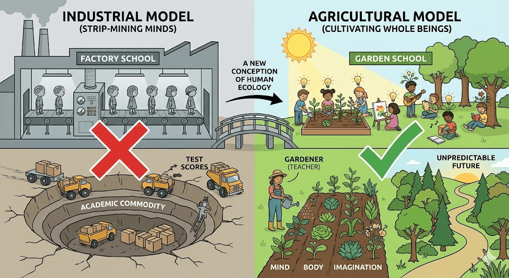 Robinson concluded that we must move from an industrial model of education to an agricultural one. We cannot make a plant grow; we can only provide the conditions under which it will flourish. Similarly, schools must stop strip-mining the minds of children for a specific commodity (academic ability) and start cultivating their whole beings—mind, body, and imagination—to prepare them for an unpredictable future.