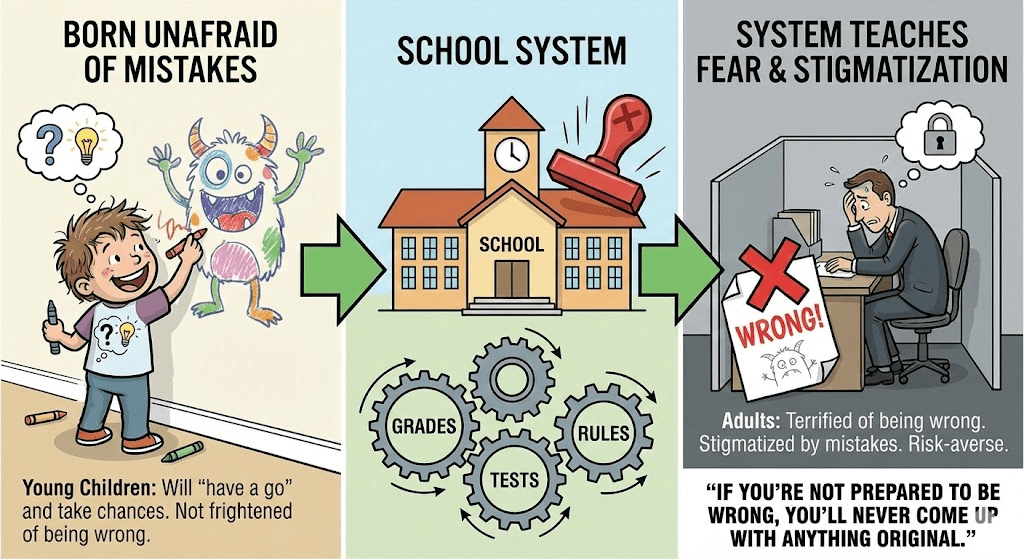 - The system teaches fear: As children move through school, they learn that mistakes are stigmatized. By the time they become adults, they are terrified of being wrong.
