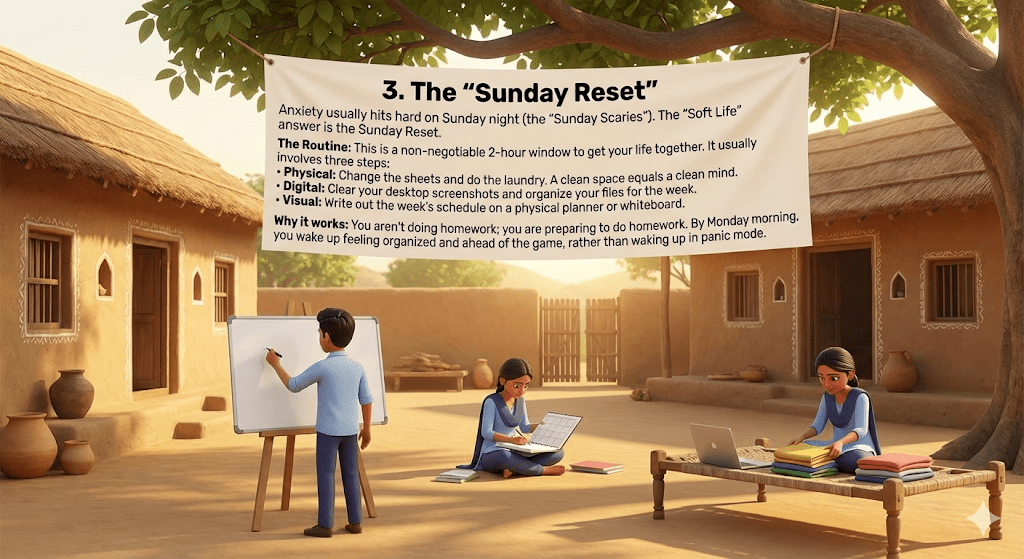 Anxiety usually hits hard on Sunday night (the “Sunday Scaries”). The “Soft Life” answer is the Sunday Reset.