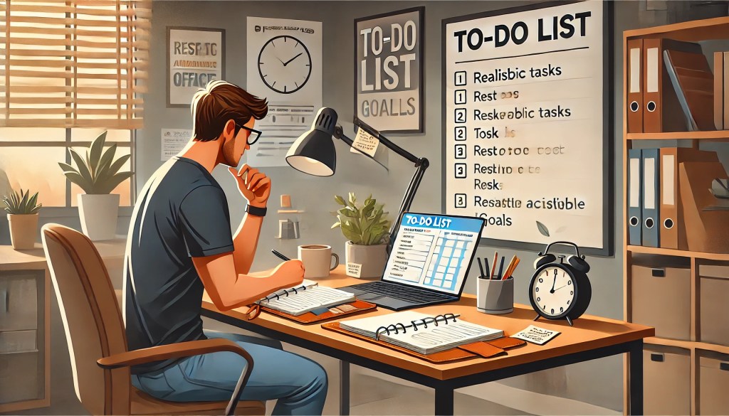 10. Set Realistic Goals: Break down tasks into manageable steps and set achievable goals. This can prevent feeling overwhelmed and promote a sense of accomplishment. Example: James breaks down his goal of completing a major work project into smaller tasks, such as outlining the project, conducting research, and writing sections, which helps him stay focused and not feel overwhelmed.